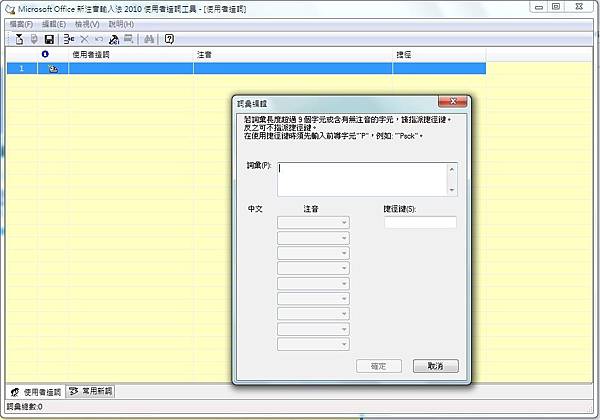 第三步:創立所需的字詞,在下圖藍底處點兩下,即會泛起詞彙編纂,可輸入所需的辭彙並設立快捷鍵,設定完成請按確定,即完成辭庫設立建設的動作,當以後打出辭庫有確立的辭彙時,即會主動選字為准確的辭彙。